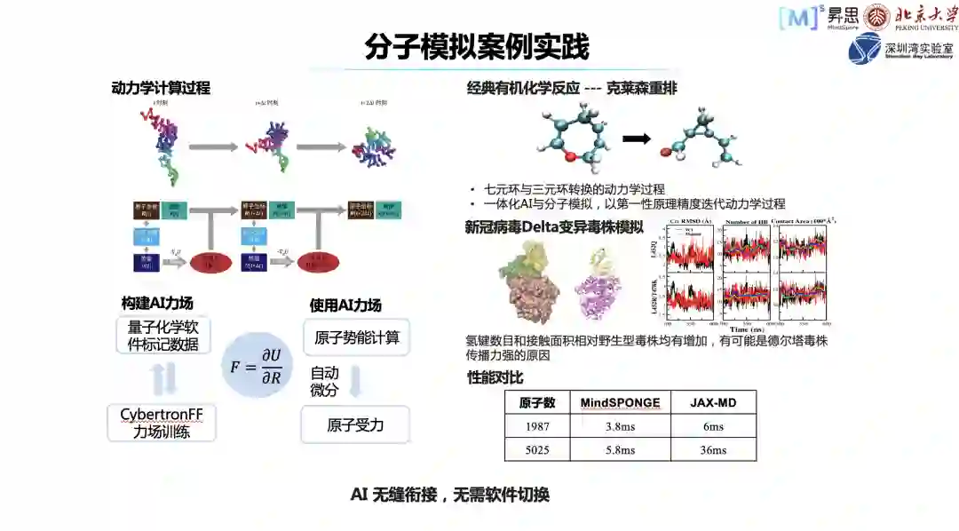 这里举几个分子动力学的案例。分子动力学主要是知道分子下一步怎么动,这里面的核心就是分子力场。不管是构建分子力场,还是使用分子力场,MindSPONGE 都提供了非常方便的使用接口。
