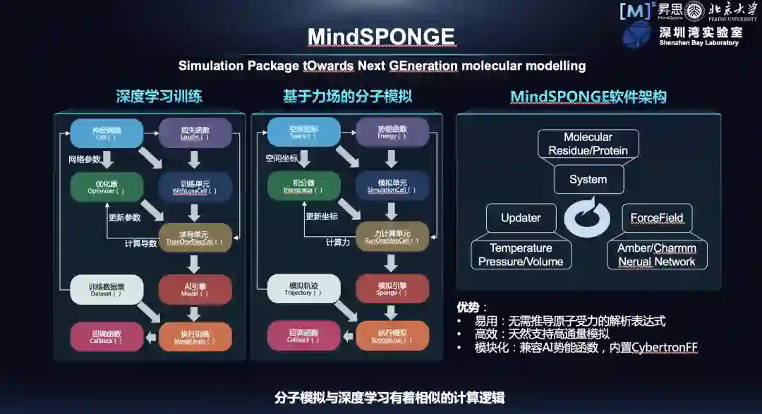 进行模块化拆分后,我们把 MindSPONGE 分为三大模块:系统建立、力场配置和迭代更新。我们有这么几个优势:1. 易用,无需推导原子受力的解析表达式;2. 高效,天然支持高通量模拟;3. 模块化,兼容 AI 势能函数。