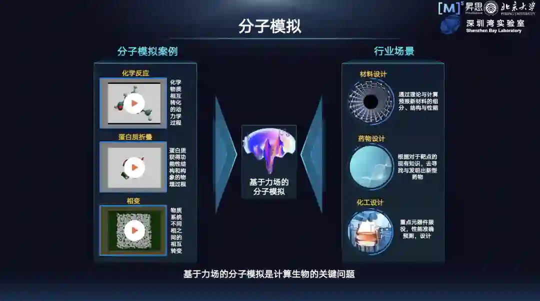 借助分子模拟技术,我们可以模拟化学反应、蛋白质折叠以及同一物质在不同状态下的相变等;在行业之中,分子模拟也是比较重要的技术,如材料设计、药物设计、化工设计等场景都离不开分子模拟。