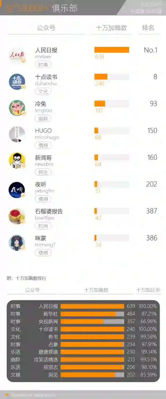 2.由于日榜的数据统计截止时间统一设定为各公众号发布次日中午,部分后续传播数据无法有效计入。为了促进公平,新榜认证出品的月榜实施了回采,将日榜统计截止时间之后的后续传播数据计入在内。