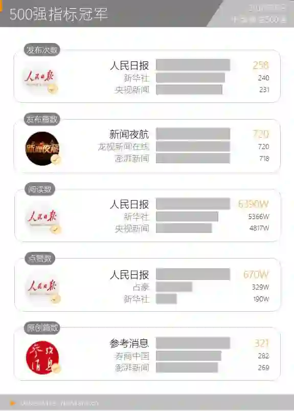 本月受自然天数的影响,发布次数、发布篇数、阅读数、点赞数、原创篇数五个指标均有所下滑,但指标冠军未有换员。其中,“人民日报”依旧包揽发布次数、阅读数和点赞数三项冠军。