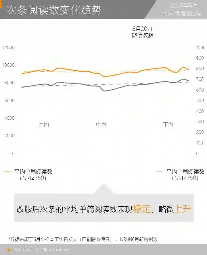针对次条内容的阅读数,从整体趋势来看,750分及以上账号和750分以下账号在改版后均有一定程度的上升。对比发现,在6月20日改版后,750分及以上账号增幅为1.7%,750分以下账号增幅较大,为4.3%。再次验证上文观点,中长尾账号或因此受益。