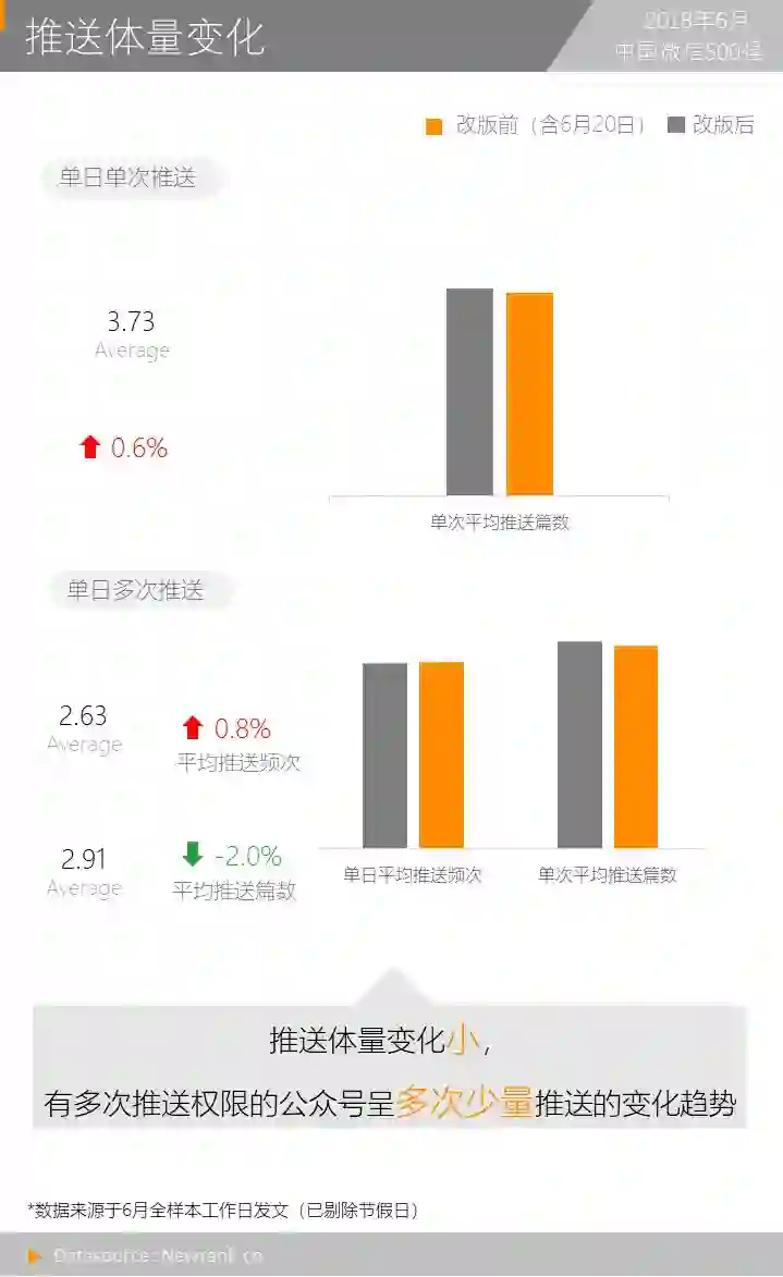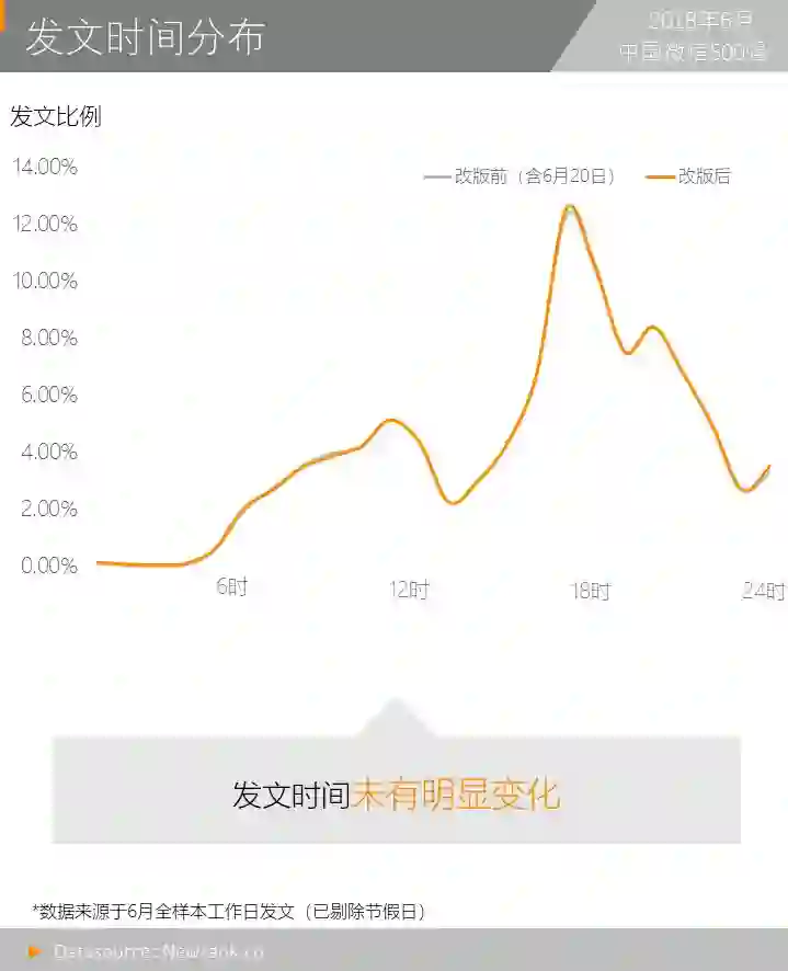微信改版后,头次条阅读数稳中有升,3-8条阅读数略微下降,菜单栏使用未见明显降幅,推文时间未受影响。