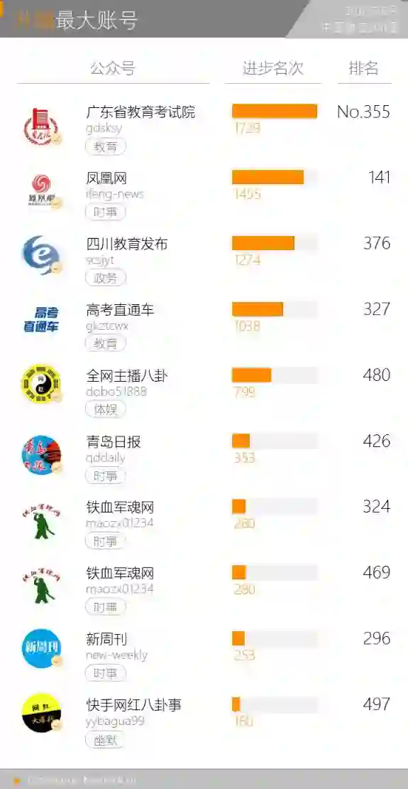 教育类公众号受益考试季,表现抢眼,“广东省教育考试院”获升幅榜冠军;
