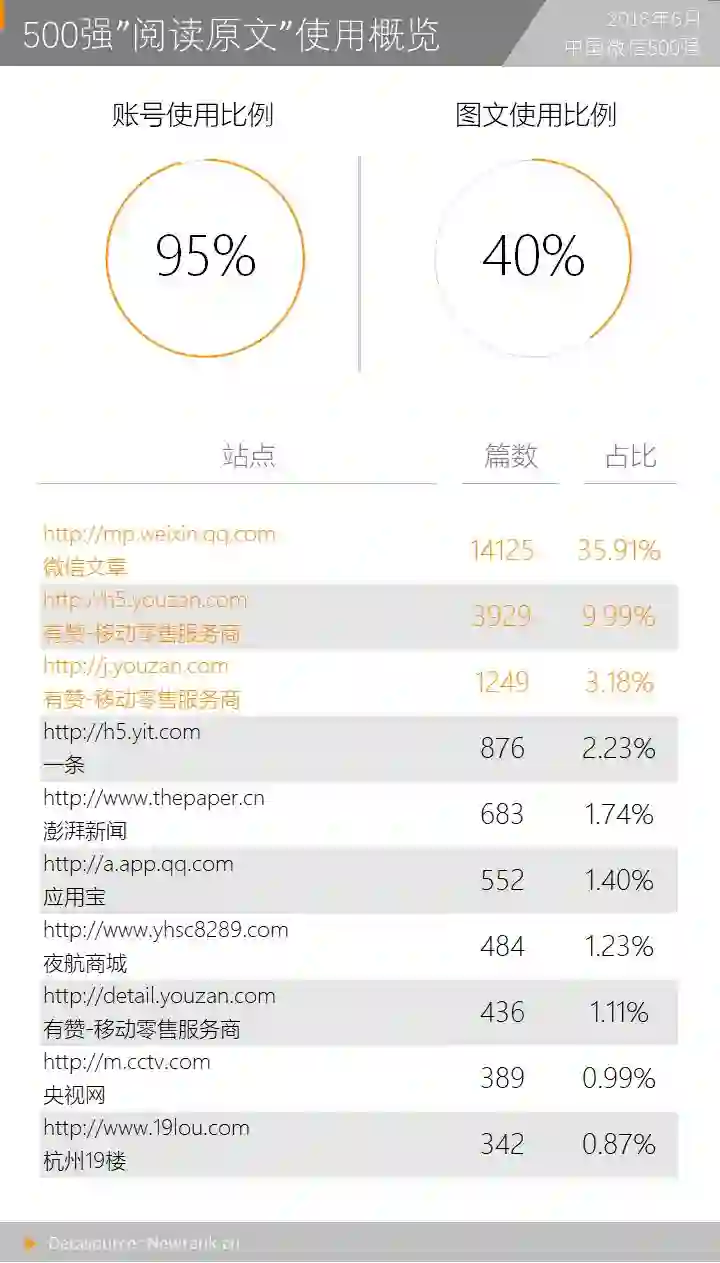 本月共有477个500强账号在39335篇内容中添加阅读原文链接,使用“阅读原文”位置的账号增加3个,图文使用比例环比上升1%。