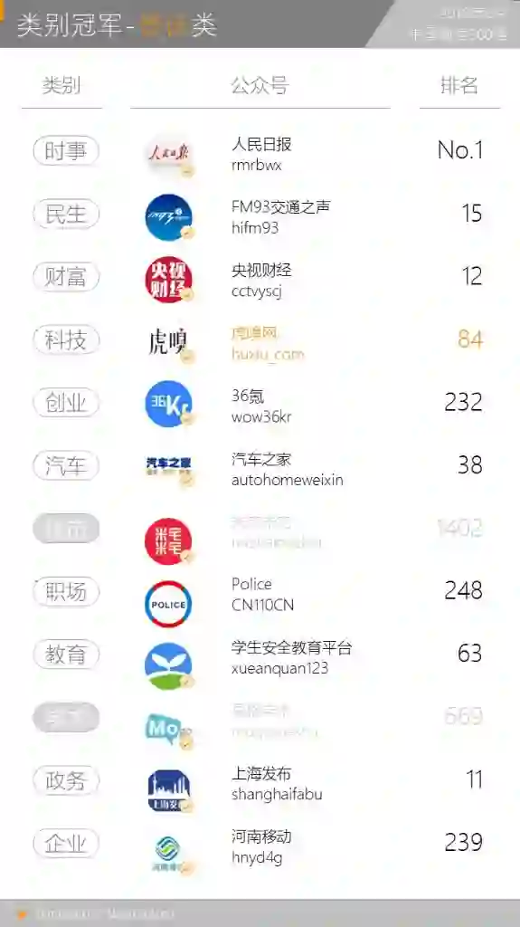 1.作为中国移动互联网内容价值标准构筑者,新榜坚信,没有内容分类的排行榜是没有比照意义的,是缺乏对内容价值深入理解能力的表现。因此,在需要打破内容类别、实施跨界对比的月榜中,新榜特意引入类别权重(具体系数可在新榜网站newrank.cn上查询),尽可能呈现一个符合社会主流价值的中国微信500强生态面貌。