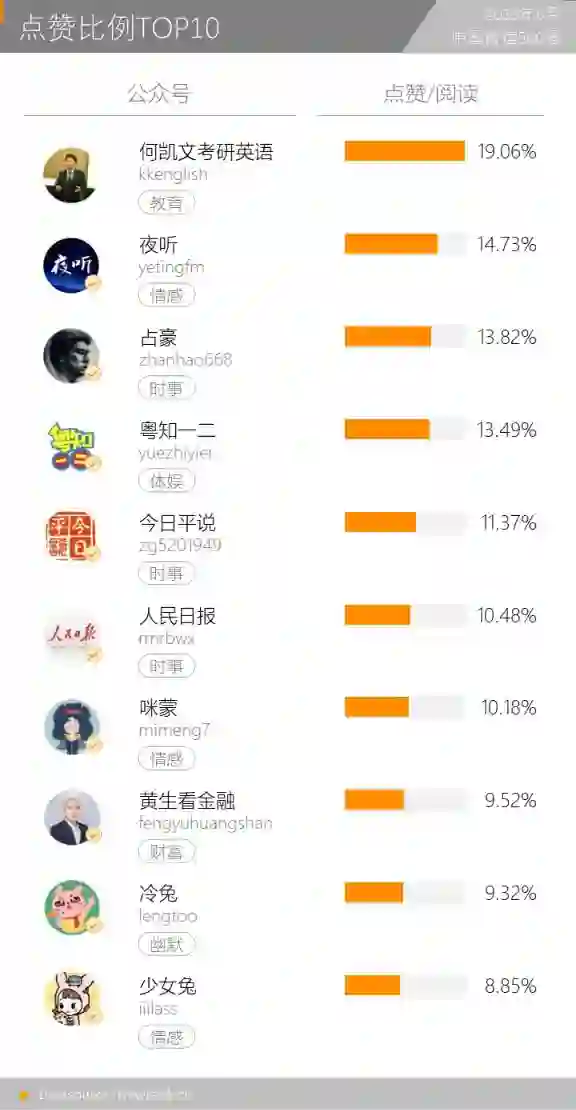 一直蝉联桂冠的“夜听”,本月点赞比例下降10.1%,至14.7%,不敌文末持续引导用户点赞的“何凯文考研英语”;“占豪”环比下降3.7%,依旧收获季军。点赞比例三甲降幅明显。 “少女兔”替代“紫竹张先生”跻身十强末位。