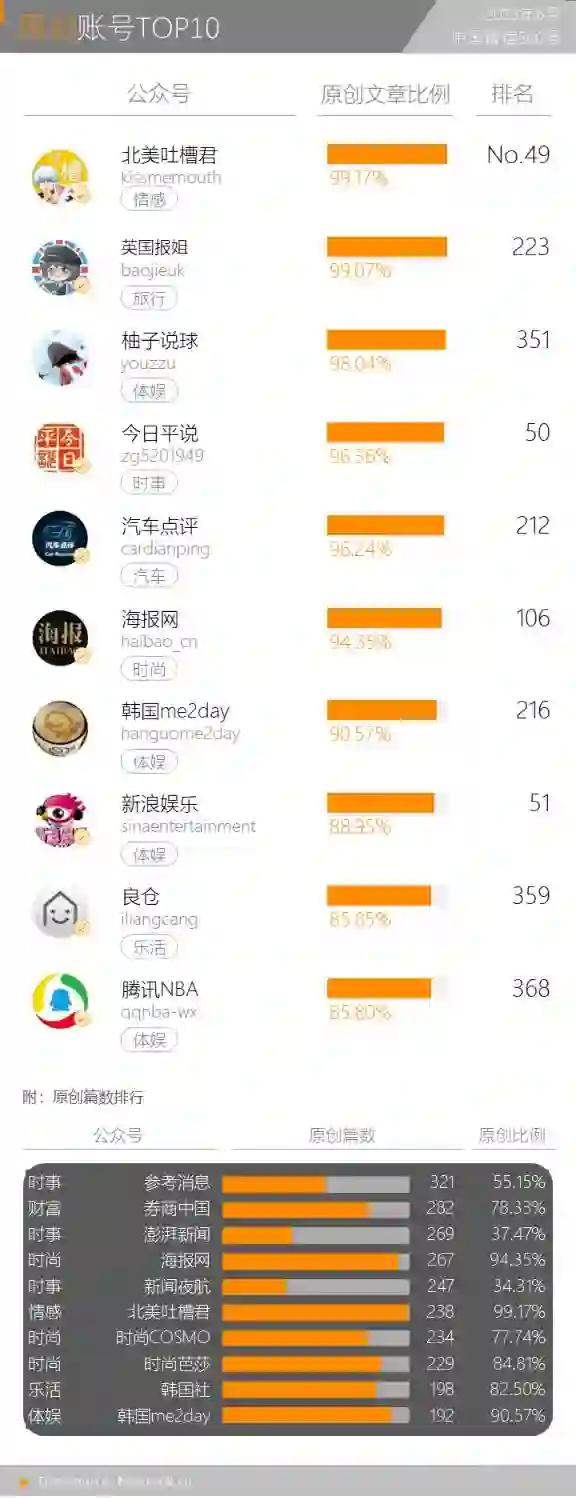 6月,原创比例门槛有所回升,十强门槛增至85.8%,换员2席。“北美吐槽君”以99.2%的原创比例收获冠军。截止目前,已有连续两个月未有100%原创账号。