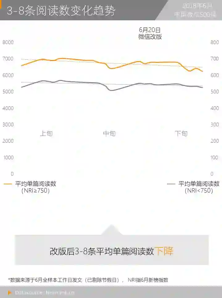 改版后,推文呈现为“标题+封面图”的形式且只展示头次条,两条以后的推文折叠,需手动展开进行阅读,从产品设计上强化了头次条而弱化了3-8条。依据6月新榜指数,将全样本划分为750分及以上(NRI≥750)和750分以下(NRI<750)两类别,同时将6月划分成上、中、下旬三个统计区间,对6月工作日的推送内容进行研究。数据表示,改版后头次条的单篇阅读数整体出现略微增长且750分以下(NRI<750)的账号增幅更大。对于大家担忧的二条以后的流量问题,数据显示,3-8条的单篇阅读数有所下降,但没有出现大幅下滑,其中750分以上的账号降幅较为明显。