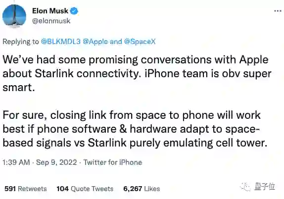 就在苹果发布会上iPhone公布了自家「捅破天」技术后,马斯克随即发推,据他称,自己及SpaceX已与苹果团队讨论过iPhone接入星链的可能性。