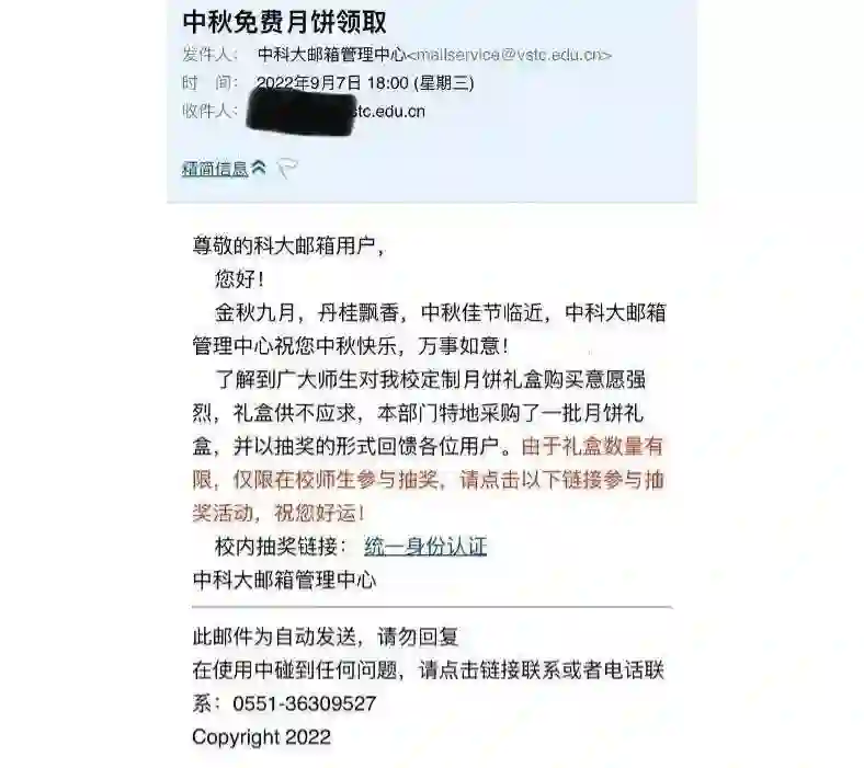中秋节前,不少中科大学生在网上称自己收到来自「中科大邮件管理中心」发出的「免费领取月饼」主题邮件,点入链接并填写资料后,发现是「钓鱼邮件」。