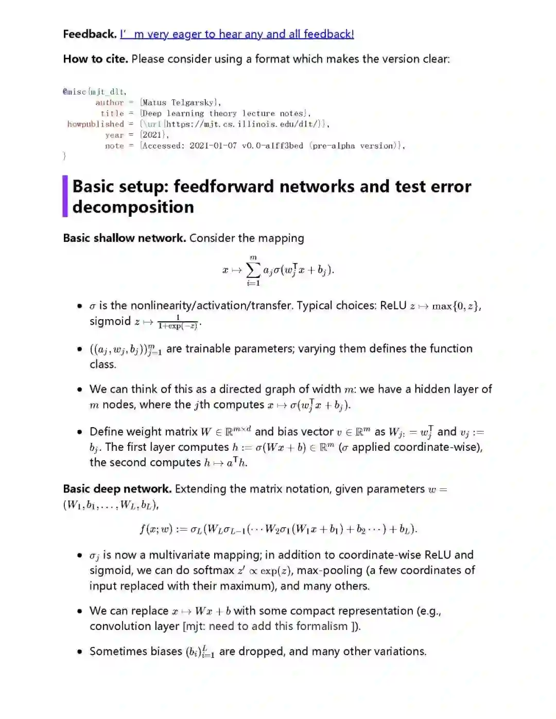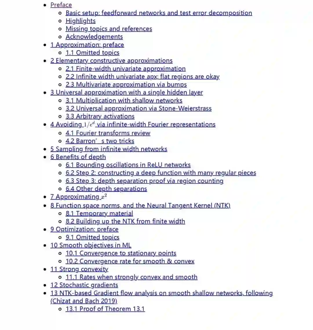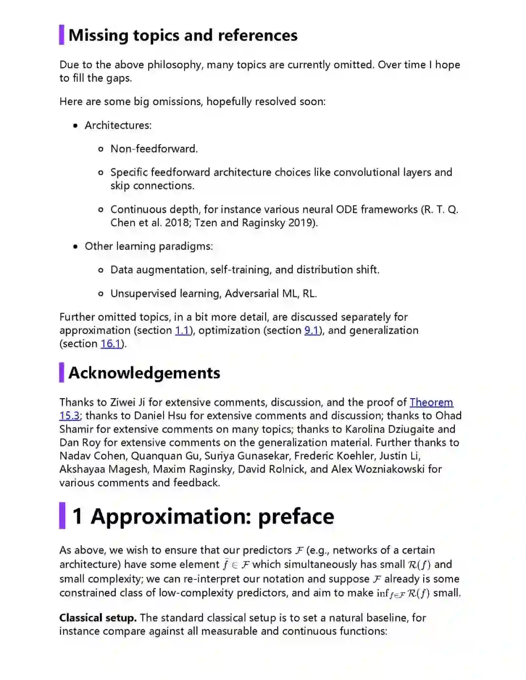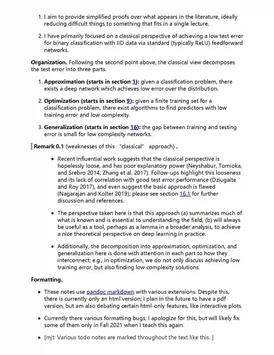 深度学习的研究在许多机器学习任务上产生了最先进的结果。大多数的进步都是由直觉和通过试验和错误进行的大规模探索推动的。因此,目前理论落后于实践。ML社区并不完全理解为什么最好的方法是有效的。来自UIUC Matus Telgarsky教授撰写了关于深度学习理论笔记,值得关注。