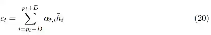 D 是开发者指定的超参数,位置 p_t 为窗口的中心,它可以设置为 t(单调性校准)或者由可微分机制确定(预测性校准),其中预测性校准基于前面生成的目标语单词信息 {y_1, ... , y_t-1},即储存在 h_t 中的信息: