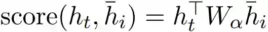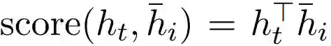 换而言之,α_t 为所有原语隐藏状态上的概率分布,即所有α_t 都在 0 和 1 之间,且加和为 1。α_t 表明原语句子中哪一个单词对预测目标语下一个单词最重要。score() 在理论上可以是任何对比函数,Luong et al. [20] 通过点乘试验该函数