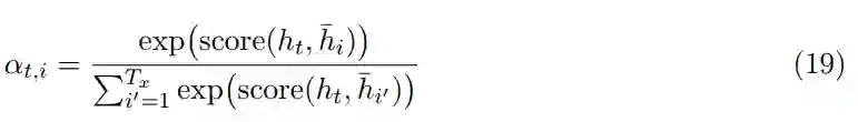 校准向量(alignment vector)α_t 需要先对当前目标语隐藏状态 h_t 和所有原语隐藏状态 h_i bar 之间做校准运算(score()),然后再对运算结果应用 Softmax: