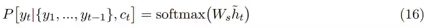 其中 h_t tilde 为注意的隐藏状态,它的计算表达式为: