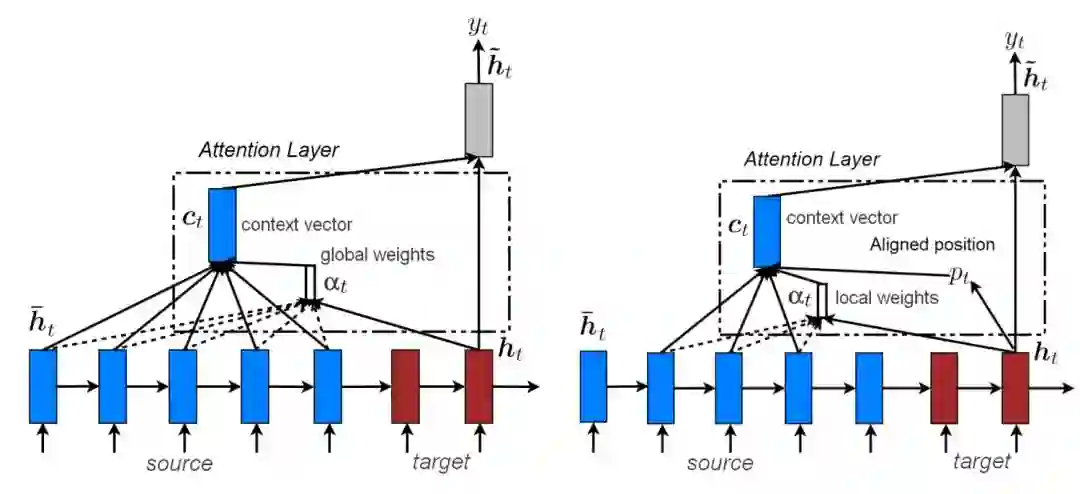 每生成单个目标词都需要考虑原语句子的所有词在计算上是非常昂贵的,也不是必需的。为了减少这种问题,Luong et al. [20] 提出了一种仅关注固定窗口大小 2D+1 的局部注意力机制: