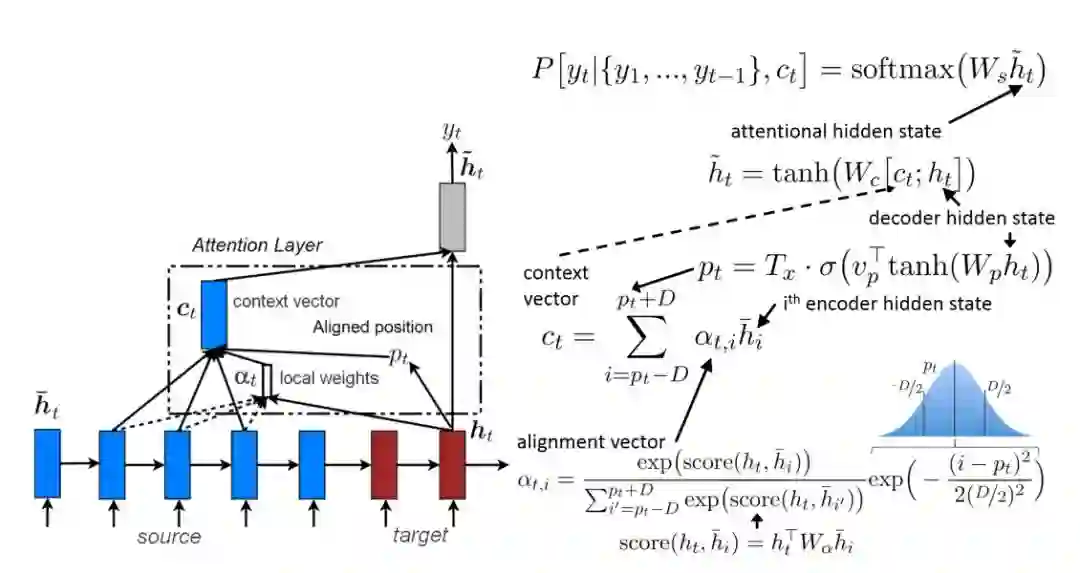 。增加的高斯分布项会确保校准权重会随着 i 远离窗口中心 p_t 而衰减,即它会认为窗口中心附近的词更重要。同样不同于全局注意力,α_t 的维度固定等于 2D+1,只有在窗口内的隐藏向量才会得到考虑。局部注意力其实也可以视为全局注意力,只不过校准权重会乘上一个截断的正态分布。下图 13 总结了局部注意力机制: