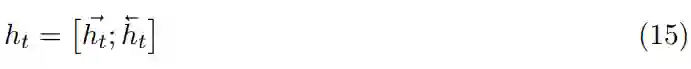 原语句子可以通过 CNN 或全连接网络等某个模型编码为一个向量,机器翻译通常会选择 RNN 作为编码器。Bahdanau[1] 等人最开始使用双向深度 RNN 网络,该模型使用两条深度单向 RNN 构建模型,且方向相反的两条 RNN 不会共享参数。第一个前向 RNN 从左到右处理原语句子,而第二条反向的 RNN 由右到左处理原语句子。两个 RNN 编码的隐向量在每一个时间步都会拼接在一起,从而作为双向 RNN 的内部表征: