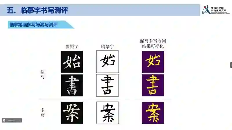 中国科学院自动化研究所研究员、文化大数据工程中心副主任王健以《智慧书法教育及其评测系统》为主题,介绍了当前书法教学中面临的问题:高水平书法教师数量欠缺、学生书法课后练习的反馈指导不及时、缺乏系统性的书法临摹智能测评算法、书法教师教学任务量较大,并介绍了书法字测评系统在服务书法教学方面的用途,从临摹字识别与校正、临摹字笔划拆解、临摹字书写测评等方面对书法字测评系统进行了详细介绍。