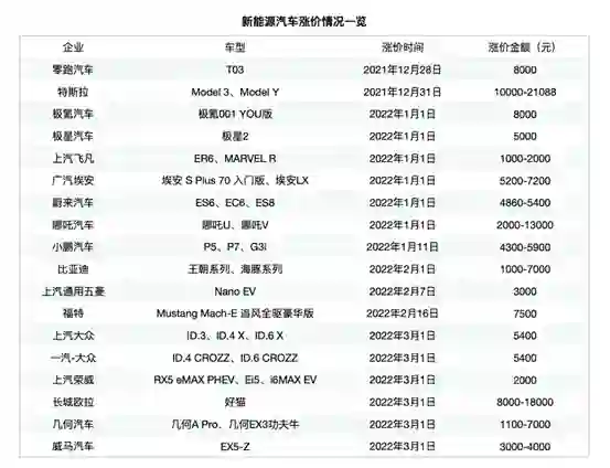 在此之前,小鹏汽车、比亚迪、上汽通用五菱、上汽大众以及一汽-大众在内的车企均先后宣布涨价,国内的主流新能源车企基本都迈入了“价格普涨期”。