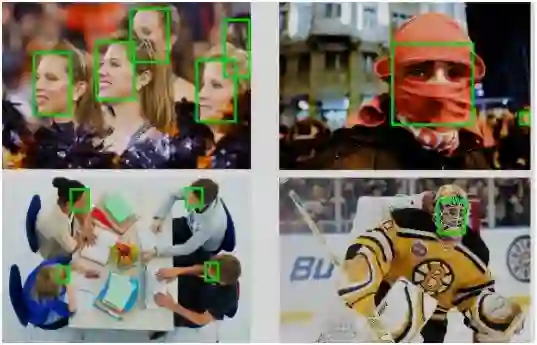 人脸检测:就是给定任意一张图片,找到其中是否存在一个或多个人脸,并返回图片中 每个人脸的位置、范围及特征等。如下图: