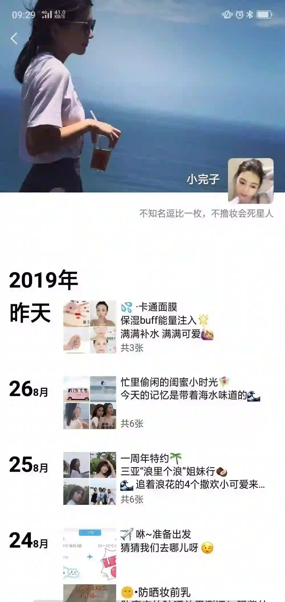 朋友圈封面里,小完子拿着半杯奶茶,戴着墨镜,发丝被微风撩起,看着远处的大海,只是侧影,看不到她神色如何。