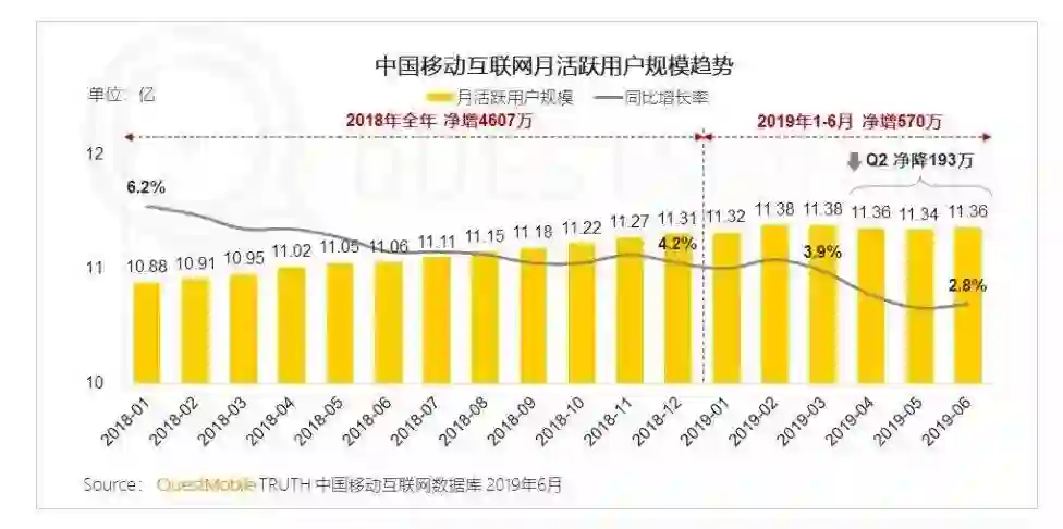 流量红利在今年真的见顶了。QuestMobile数据显示,2019年第二季度,全网移动互联网月活跃用户规模减少了193万,触顶11.4亿。存量的拼杀里,百度系和腾讯系的用户时长占比均有下降,腾讯系一度下滑了3.6%。