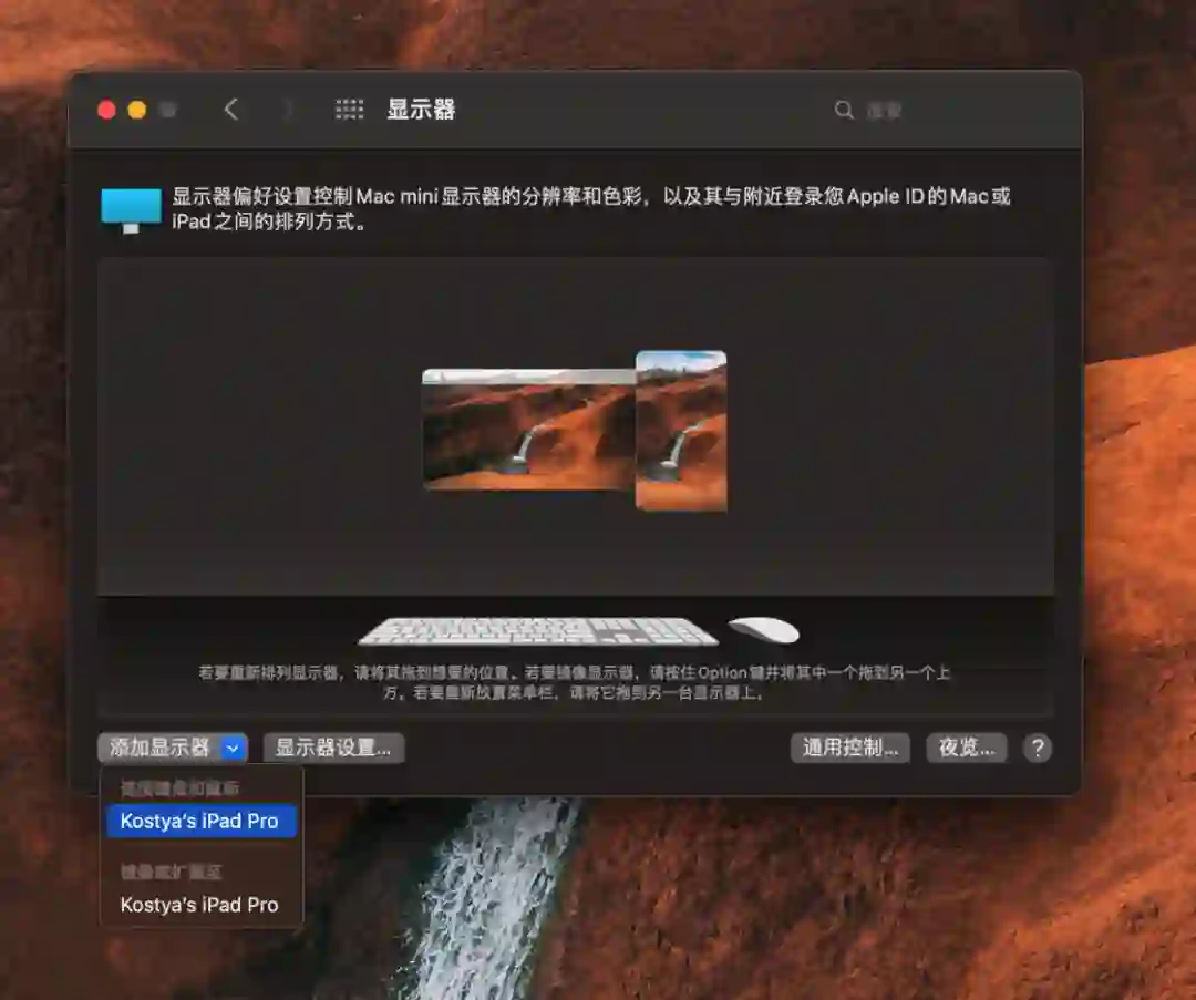 ,点击「添加显示器」旁边的小箭头,然后选择「用作鼠标和键盘」下的你的 iPad 名称,即可设置完毕。此时,iPad 应当已经与 Mac 建立连接,并且显示在显示器的面板中。如果 iPad 的位置并未自动进行调整,我们可以通过拖动 iPad 屏幕的方式手动重新排列。
