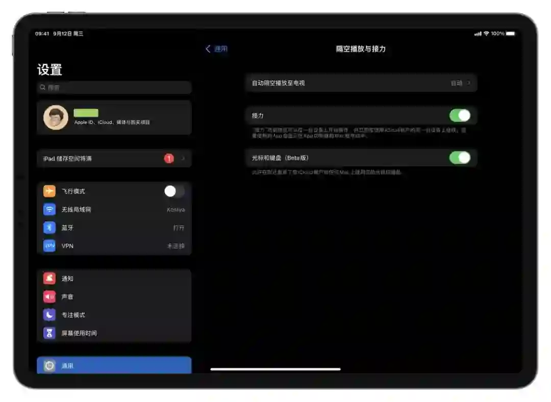 中找到「光标和键盘(Beta 版)」的开关。打开它,就完成了在 iPad 上设置 Universal Control 的步骤。