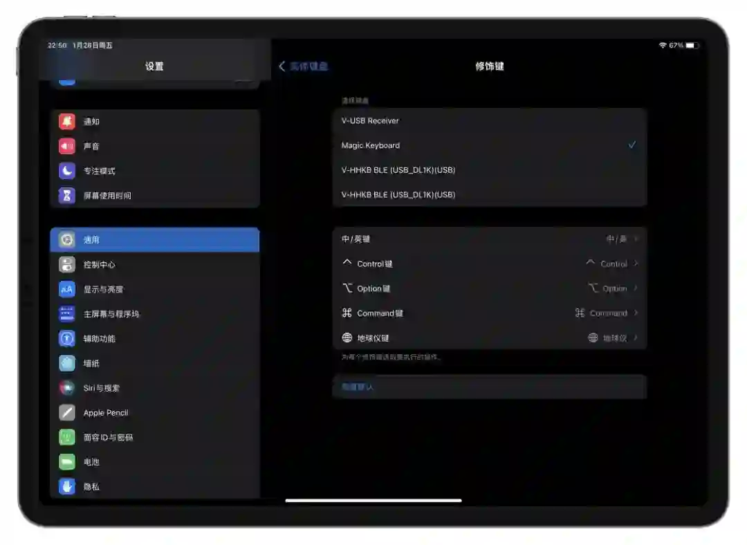 设置 - 通用 - 键盘 - 实体键盘 - 修饰键