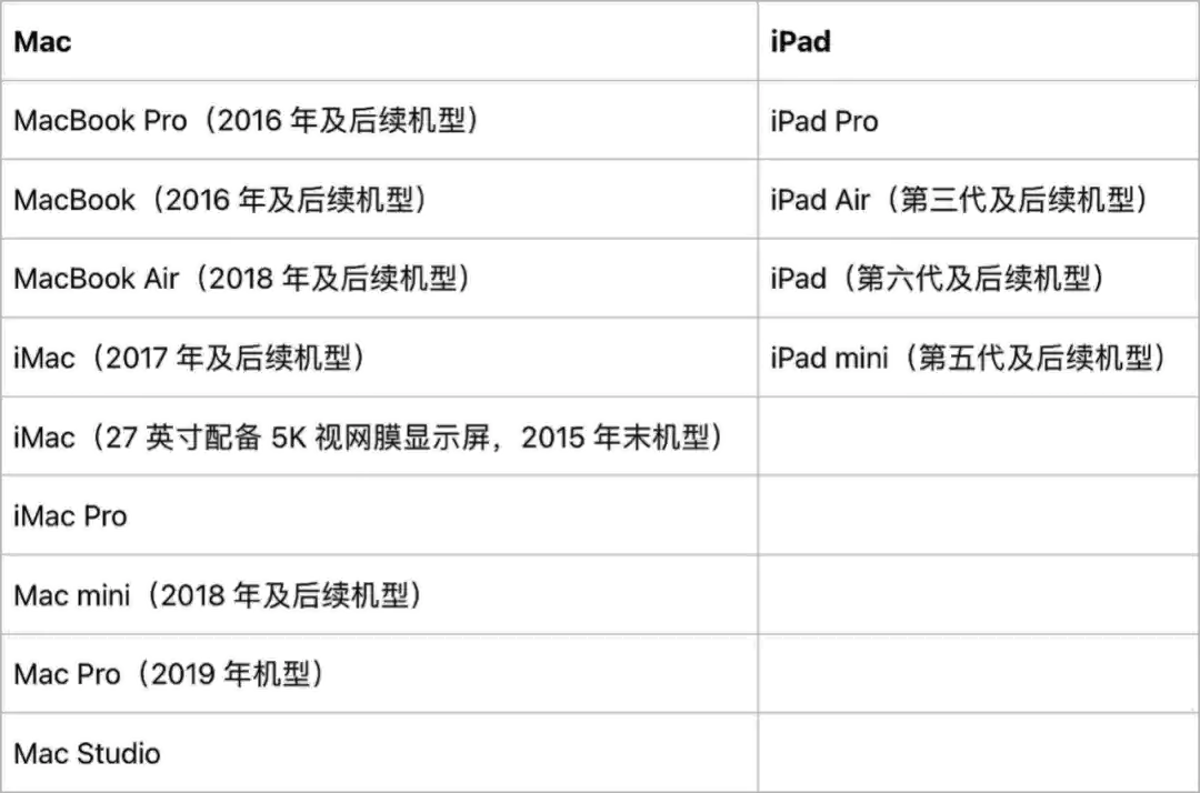 根据 Apple 官网脚注的信息,Universal Control 功能适用于以下设备: