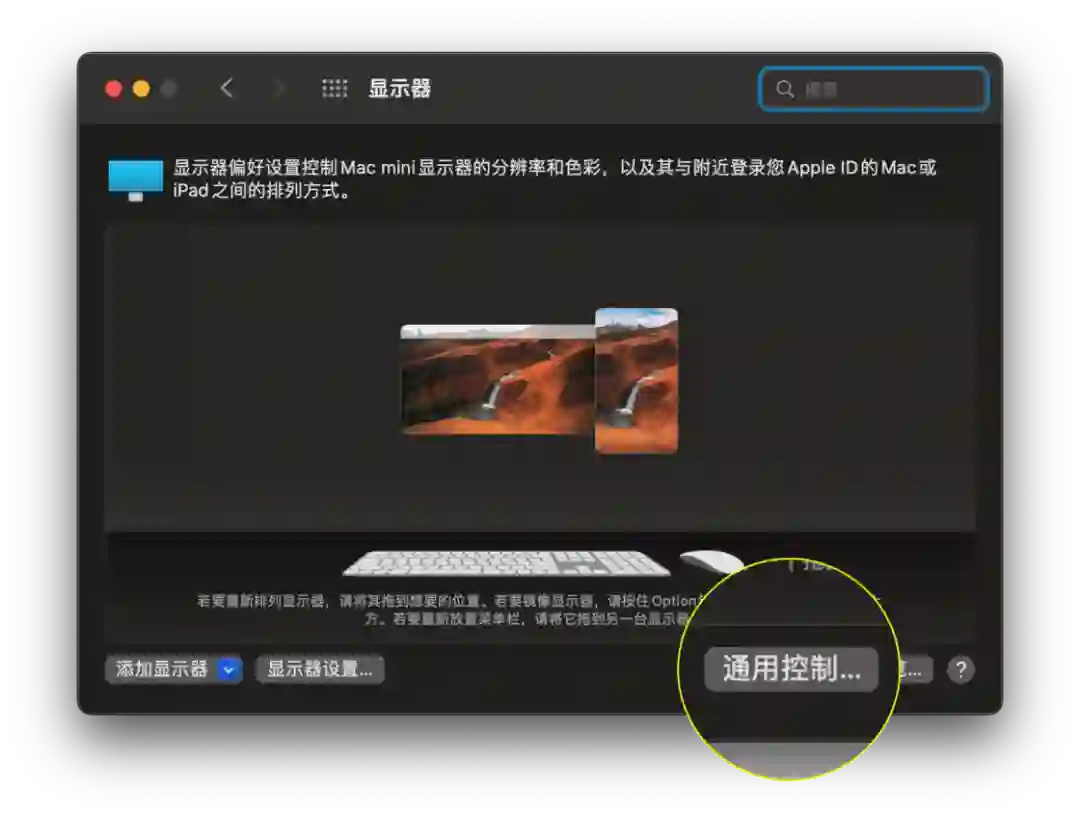 在 Mac 电脑上还可以找到一些与 Universal Control 有关的高级设置,包括「移到屏幕边缘自动连接」,以及「自动重新连接已知的 Mac 和 iPad」。这些设置可以在「显示器偏好设置」的右下角「通用控制…」按钮中找到。
