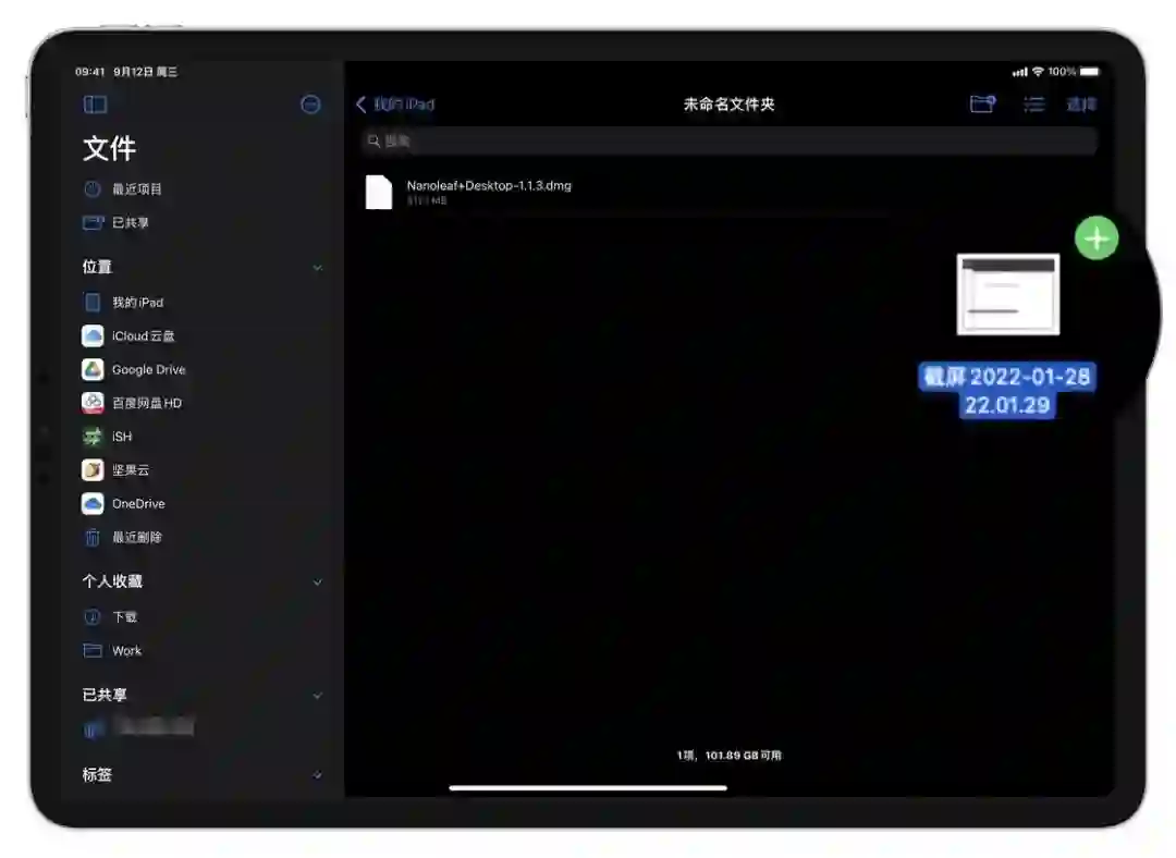 将 Mac 上的文件拖入 iPad 「文件」app 时的效果