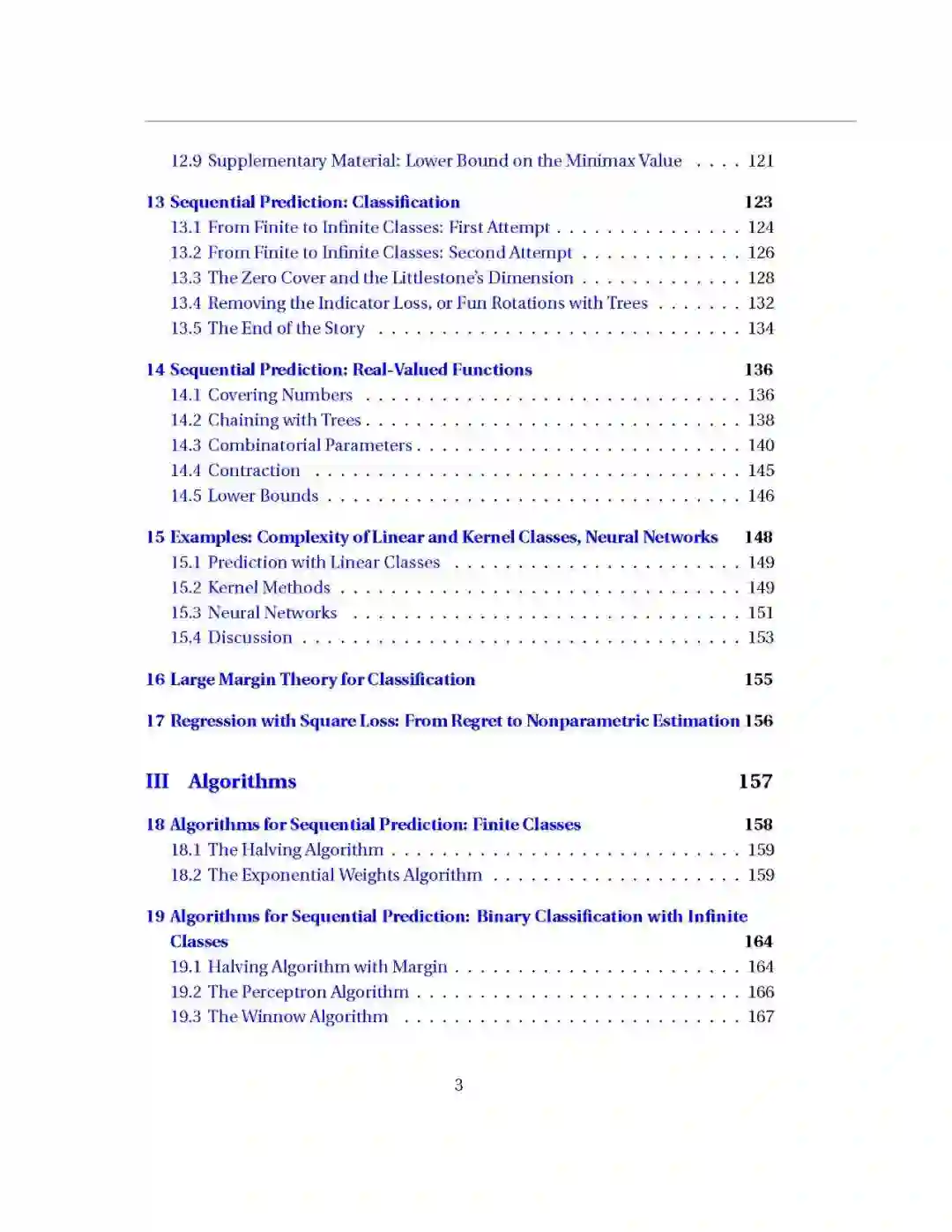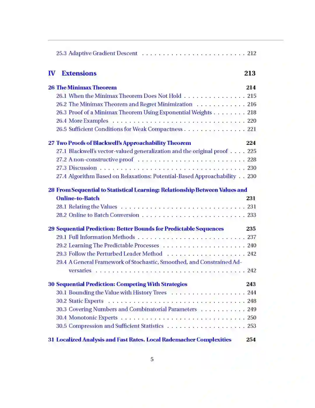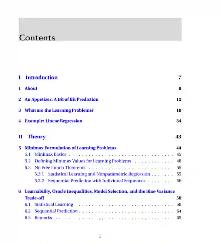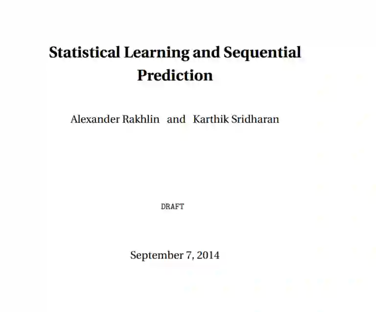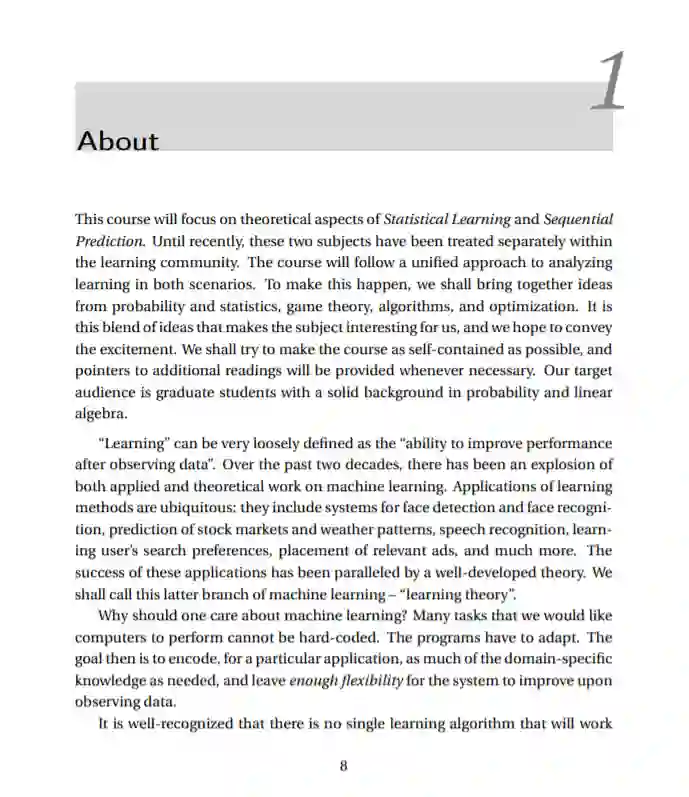 本书将侧重于统计学习和序列预测(在线学习)的理论方面。在本笔记的第一部分,我们将使用经典的工具:集中不等式、随机平均、覆盖数字和组合参数来分析学习的i.i.d.数据。然后,我们将重点放在序列预测上,并开发许多用于在此场景中学习的相同工具。后一部分是基于最近的研究,并提出了进一步研究的方向。我们在整个课程中强调的极大极小方法,提供了一种比较学习问题的系统方法。除了理论分析,我们将讨论学习算法,特别是学习和优化之间的重要联系。我们的框架将处理开发接近最优和计算效率的算法。我们将用矩阵补全、链路预测等问题来说明这一点。如果时间允许,我们将深入了解信息理论和博弈论,并展示我们的新工具如何无缝地产生许多有趣的结果。