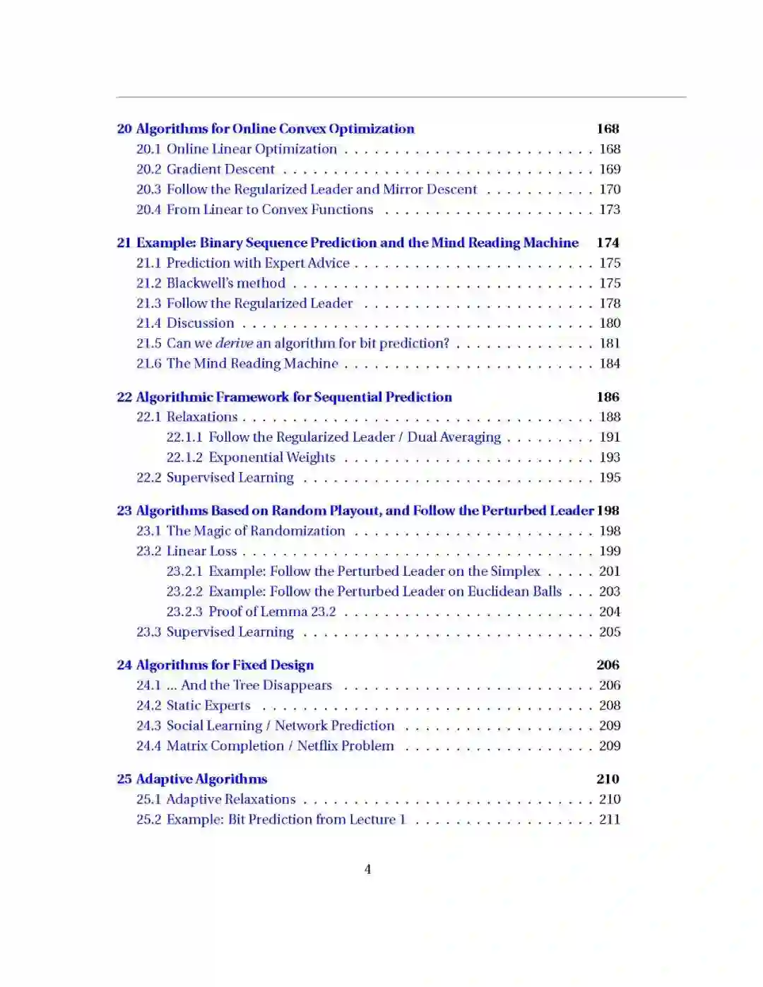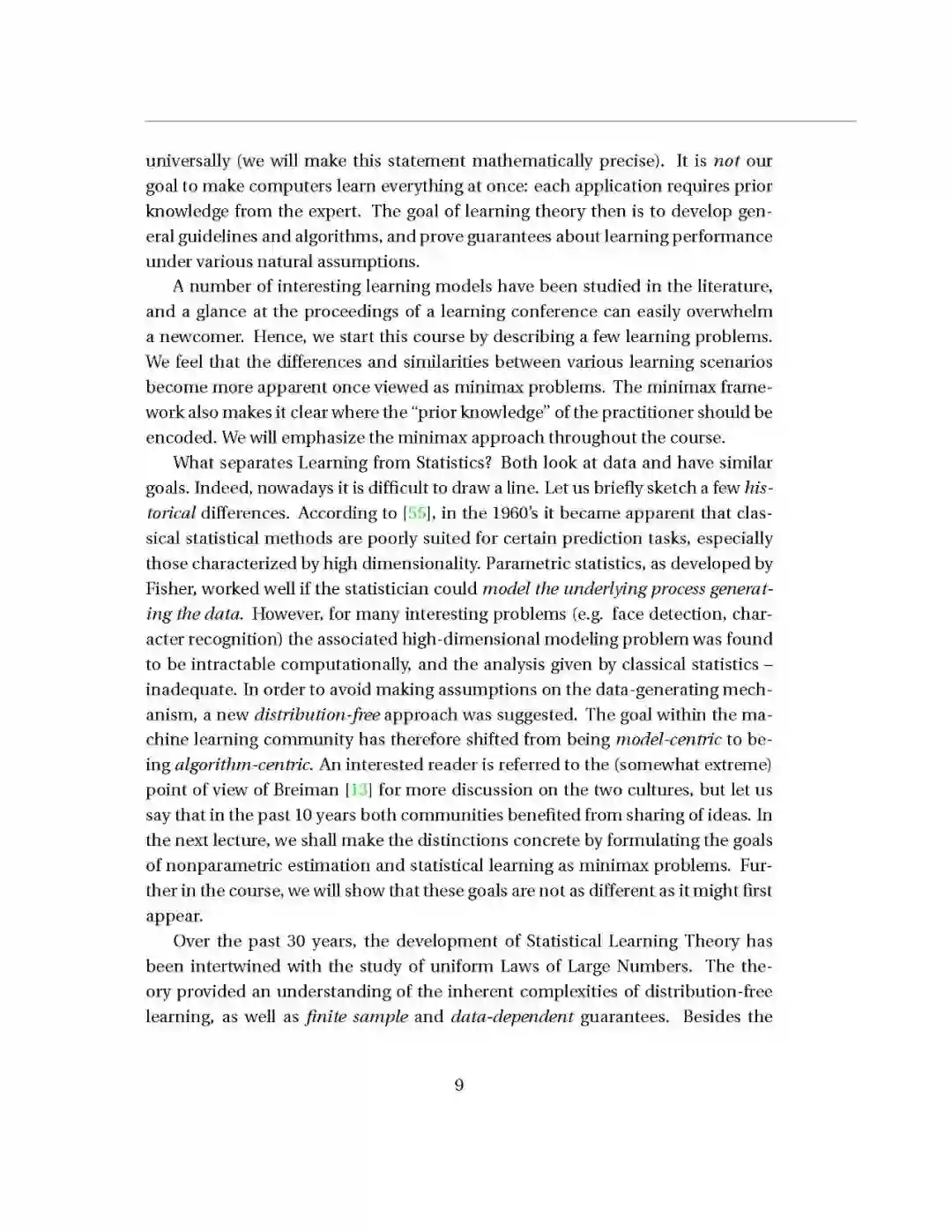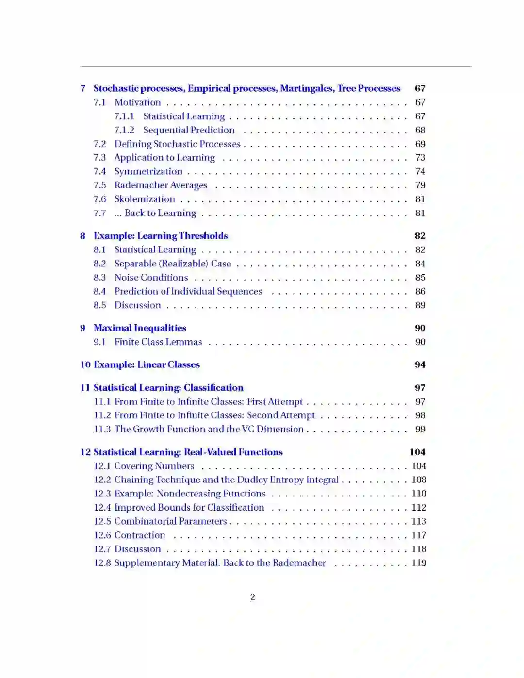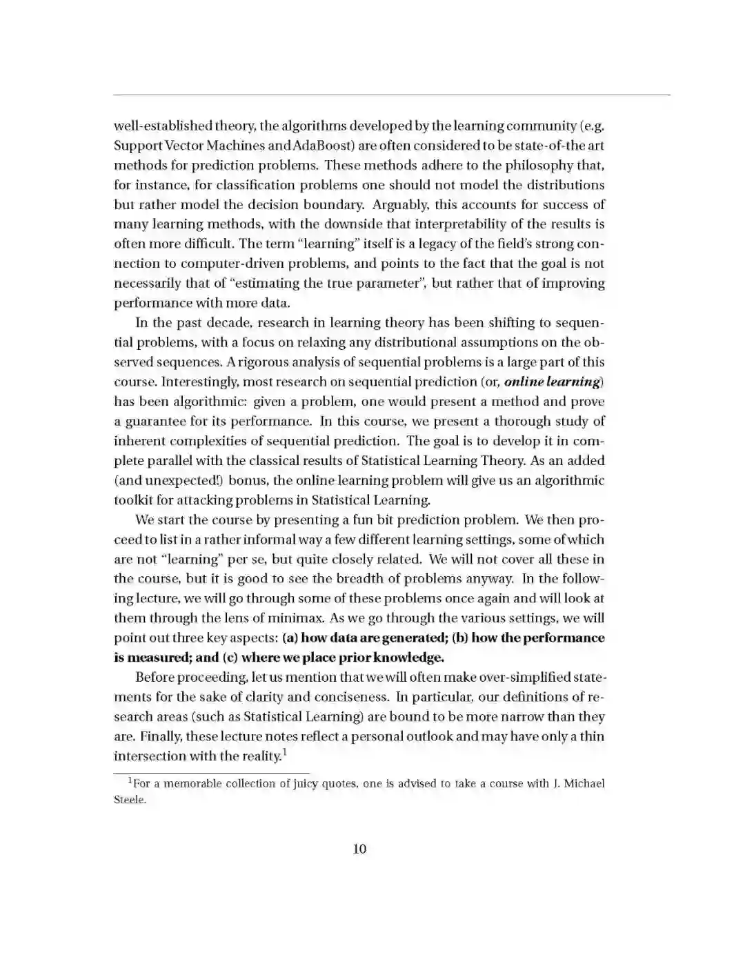 本书将侧重于统计学习和序列预测(在线学习)的理论方面。在本笔记的第一部分,我们将使用经典的工具:集中不等式、随机平均、覆盖数字和组合参数来分析学习的i.i.d.数据。然后,我们将重点放在序列预测上,并开发许多用于在此场景中学习的相同工具。后一部分是基于最近的研究,并提出了进一步研究的方向。我们在整个课程中强调的极大极小方法,提供了一种比较学习问题的系统方法。除了理论分析,我们将讨论学习算法,特别是学习和优化之间的重要联系。我们的框架将处理开发接近最优和计算效率的算法。我们将用矩阵补全、链路预测等问题来说明这一点。如果时间允许,我们将深入了解信息理论和博弈论,并展示我们的新工具如何无缝地产生许多有趣的结果。
