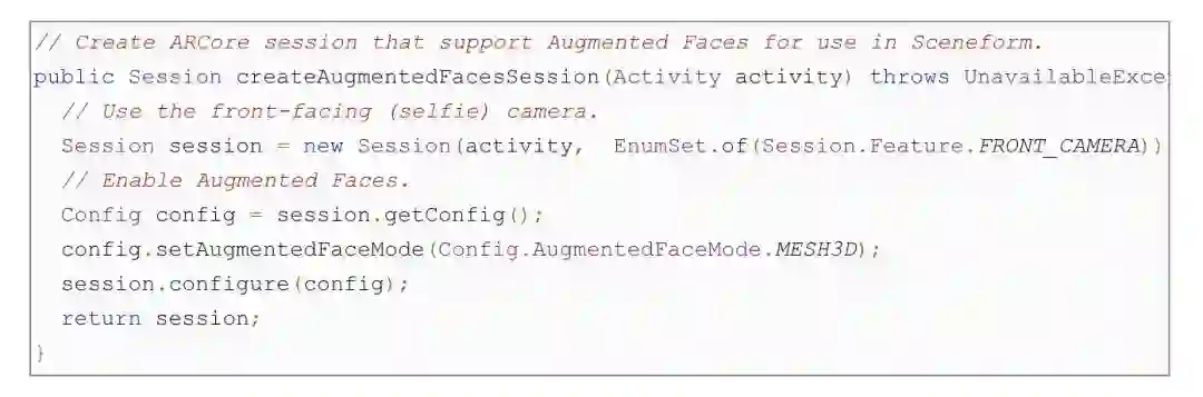 Google 提供 Unity 和 Sceneform 版本的 Augmented Faces 示例程序,你可以从那里开始。只需创建 ARCore Session 的时候,指定 “front-facing camera”和启用 Augmented Faces “mesh” 模式即可。值得注意的是,使用前置摄像头时,其他 AR 功能如平面检测,目前还不支持。