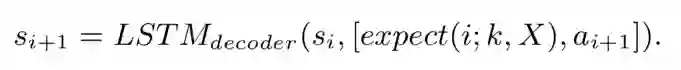 其中expect (i;k,X)∈R表示在给定样式id为k且输入序列为X的情况下,i时刻的Expected Character Embedding,c∈V表示词汇表中的所有字符。然后在解码阶段,将expect(i; k, X) 输入LSTM来更新隐藏状态以生成下一个预期字符。