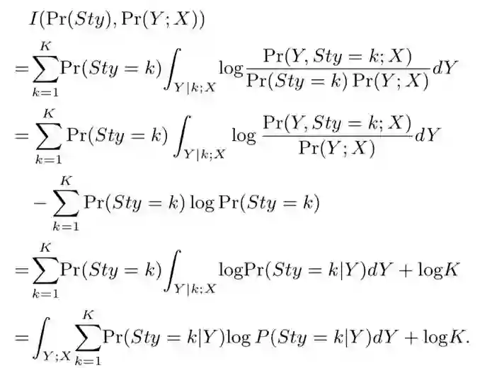 不失一般性,模型中假定输入风格ID是一个均匀分布的随机变量Sty,并且Pr(Sty=k) = 1/k. 回想前面的关于互信息的定义我们不难发现,模型需要最大化风格随机分布Pr(Sty)与生成句子的随机分布Pr(Y;X). 具体模型可以详细参照图2,因而二者的互信息可以计算为: