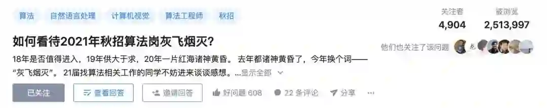 小夕前几天在知乎上看到一个问题《如何看待2021年秋招算法岗灰飞烟灭》被顶上了热榜。