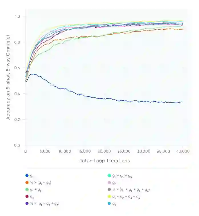 下图显示了在 Omniglot 上由梯度之和作为元梯度而绘制出的学习曲线。g2对应一阶MAML,也就是原先MAML论文中提出的算法。由于方差缩减,纳入更多梯度明显会加速学习过程。需要注意的是,仅仅使用g1(对应k=1)并不会给这个任务带来改进,因为零样本学习的性能无法得到改善。