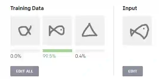 尝试单击“Edit All”按钮,绘制三个不同的形状或符号,然后在右侧的输入区中绘制其中一个,并查看Reptile如何对它进行分类。前三张图是标记样本,每图定义一个类别。最后一张图代表未知样本,Reptile要输出此图属于每个类别的概率。