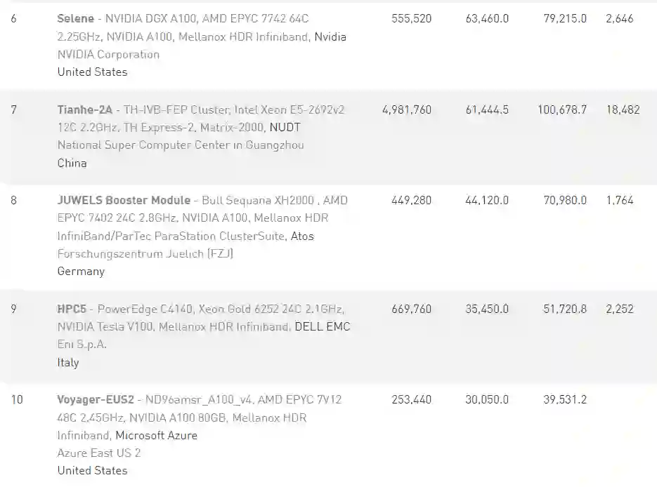 天河二号A(银河二号A)由中国国防科技大学(NUDT)开发,部署在广州国家超级计算机中心,理论峰值性能为100.7Pflop/s,实际最大算力为61.4 Pflop/s,排名第七。