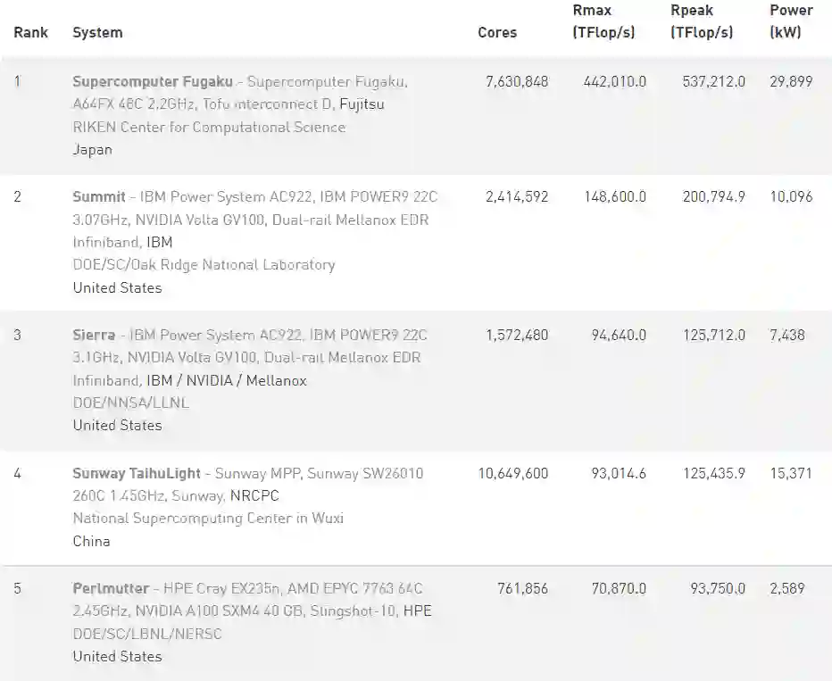 自 2020 年 6 月首次登上榜首以来,日本超算Fugaku(富岳)一直稳坐头名,算力优势明显。