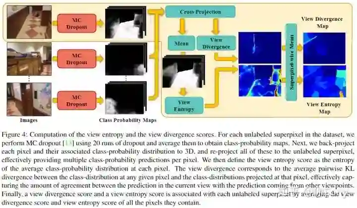 作者提出了 ViewAL,这是一种新颖的语义分割主动学习策略,它利用了多视图数据集中的视点一致性。作者的核心思想是,跨视点的模型预测的不一致提供了非常可靠的不确定性度量,并鼓励模型在不考虑观察对象的视点的情况下表现良好。为了结合这种不确定性度量,作者引入了一种新的视点熵公式,这是作者主动学习策略的基础。此外,作者提出了超像素级别的不确定性计算,它利用了分割任务中固有的局部信息,直接降低了注释成本。视点熵和超像素的联合使用有效地选择了具有高度信息量的样本。