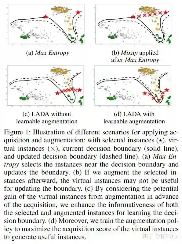 在主动学习的获取过程中尚未考虑从数据增强产生的虚拟实例的潜在收益。在数据获取的过程中,数据增强将选择并生成对训练模型提供信息的数据实例。因此,作者提出了通过增强或 LADA 的前瞻数据采集来集成数据采集和数据增强。在获取过程之前,LADA 考虑 1) 选择未标记的数据实例和 2) 通过数据增强生成的虚拟数据实例。此外,为了增强虚拟数据实例的信息量,LADA 优化了数据增强策略以最大化预测获取分数,从而产生了 InfoMixup 和 InfoSTN 的提议。由于 LADA 是一个可推广的框架,作者试验了各种采集和增强方法的组合。