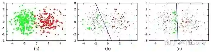 (a) 一个由400个实例组成的数据集,从两类高斯分布均匀采用。实例表示为二维特征空间中的点。(b) 从问题域中随机抽取30个标记实例,训练一个逻辑回归模型。这条蓝线代表了分类器的决策边界(70% 的准确率)。(c) 使用不确定性抽样对30个主动查询实例进行训练的逻辑回归模型(90%)。(Burr Settles, 2010)