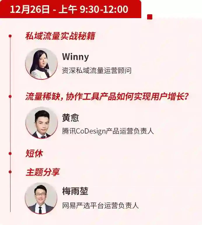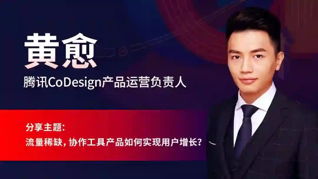 腾讯 CoDesign 产品运营负责人@黄愈老师,拥有多年内容营销与增长裂变实战经验,操盘过多个千万 GMV 营销活动;既操刀过 C 端、也做过 B 端 SaaS 产品从 0-1 的增长落地。本场大会,他将从自己的实战经历出发,跟我们分享在流量稀缺的环境下,协作工具产品如何实现用户增长?