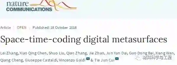 近日,东南大学毫米波国家重点实验室崔铁军教授课题组在信息超材料领域取得新进展,研究成果以“Space-time-coding digital metasurfaces(时空编码数字超表面)”为题,10月18日在线发表于《自然通讯》(Nature Communications)。东南大学为第一署名单位,崔铁军教授为论文通讯作者,博士生张磊为第一作者,意大利Sannio大学的Vincenzo Galdi教授为共同通讯作者。合作者还包括崔铁军教授课题组的硕士生陈晓晴、博士生刘硕、张茜、赵捷、戴俊彦、白国栋;万向副教授、程强教授,以及意大利Sannio大学的Giuseppe Castaldi教授。