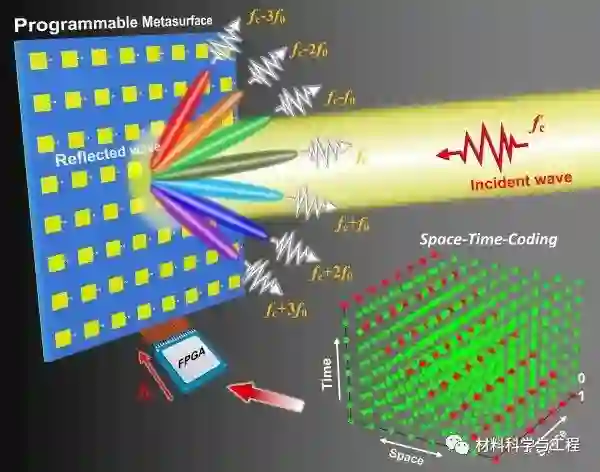 然而,之前关于数字编码与可编程超材料的研究工作仅在空间域进行编码。近来,东南大学毫米波国家重点实验室程强教授、崔铁军教授和东南大学移动通信国家重点实验室金石教授及其博士生赵捷、阳析等提出时间编码超材料的概念(arXiv 1806.04414),可对电磁频谱进行任意调控。在该Nature Communications论文中,崔铁军教授等人首次提出了“时空编码数字超表面”,特殊设计的可编程超表面在时间域上按照相应的时间编码序列快速切换,可以在频率域产生谐波能量分布。同时结合空间域的编码排布,一款时空联合编码的数字超表面可以在空间域和频率域同时调控电磁波。